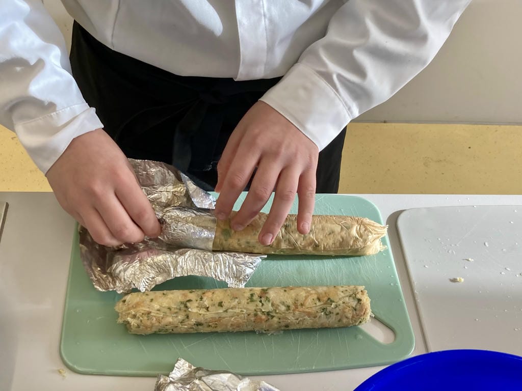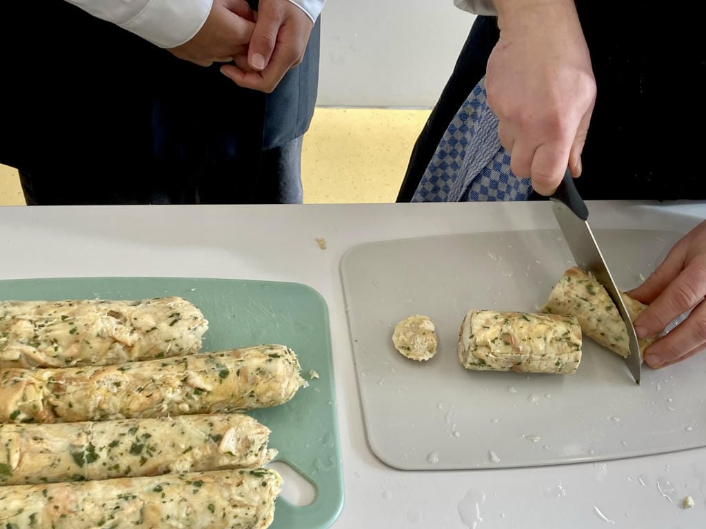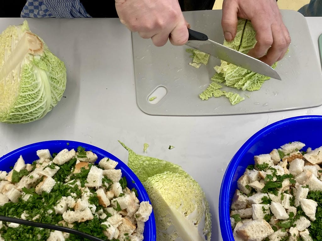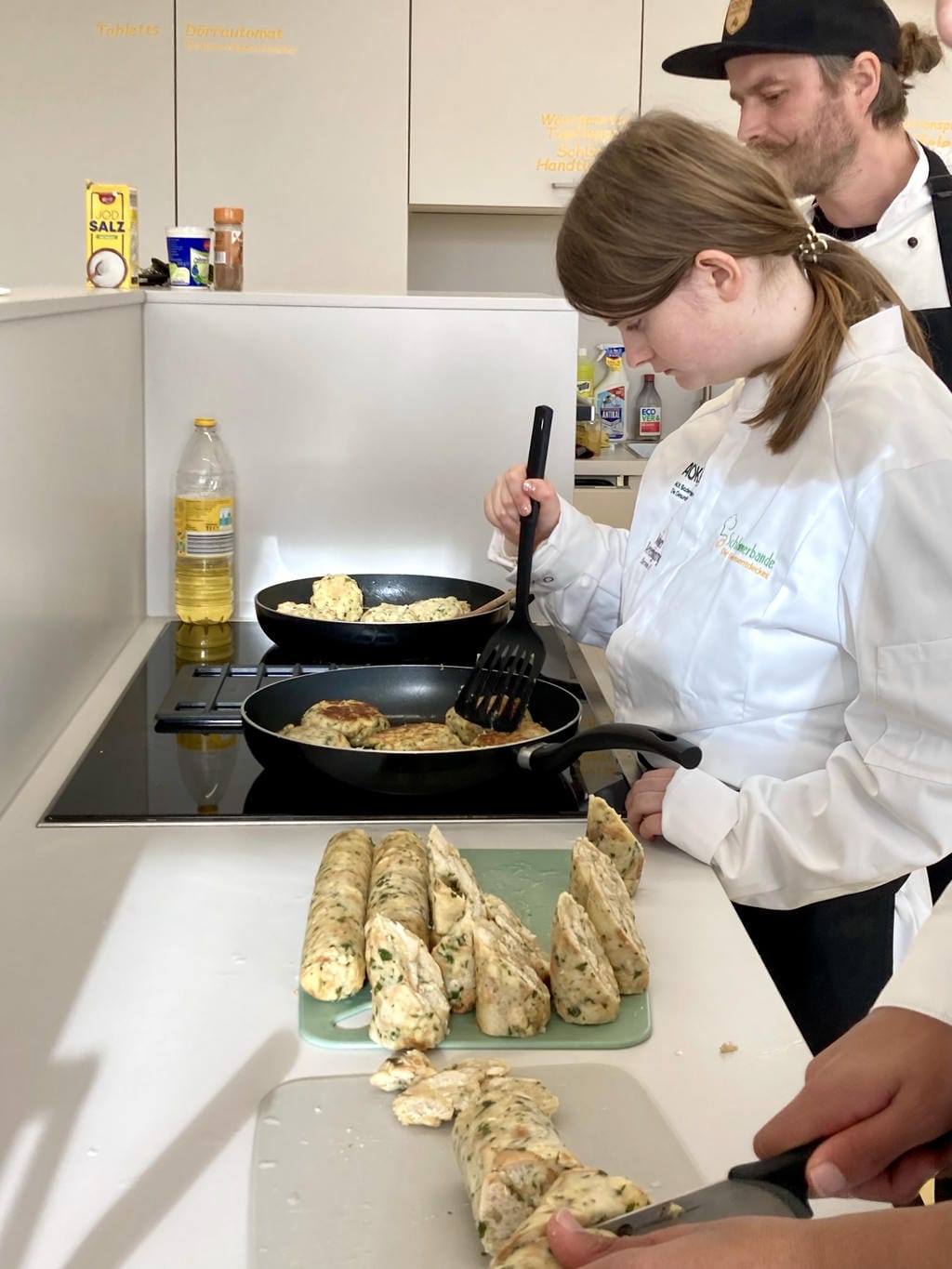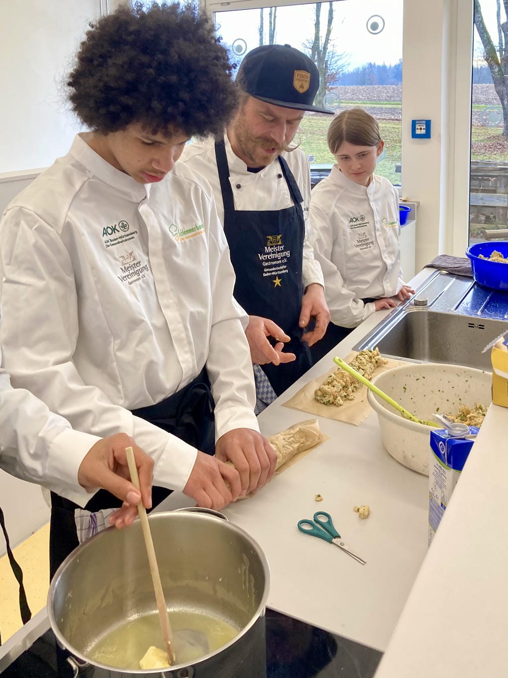 Nachdem das gemeinsam durchgezogen ist, geht es um angenehmere Dinge wie zum Beispiel Serviettenknödel herstellen. Weiches Toastbrot mit Eigelb, Eiweiß, Milch und mehr vermengen und einrollen. Früher – und manchmal heute noch – hat man das in Stoffservietten gemacht. Hier aber wird die Masse vor dem Dämpfen erst in Backpapier und dann in Alufolie eingewickelt. Mit jeder Rolle, die Ismael macht, wird das gleichmäßiger. Aber der 15-Jährige hat ja sogar schon bei einem Praktikum in eine Profiküche reingeschnuppert und zuletzt mit dem gleichaltrigen Adam zu Hause Lachs zubereitet. Adam macht mit seinem Vater am liebsten Couscous. Justins Mutter hat selbst einen Cateringservice. Auch Johanna, derzeit das einzige Mädel im Team, kocht manchmal in der Familie.