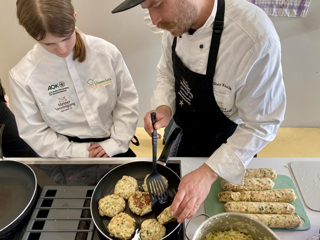 Insofern sind die Koch-Doppelstunden mit der Schlemmerbande eine ideale Ergänzung im Programm. Die meisten Bandenmitglieder machen auch bei der Schülerfirma „Tolle Wurst“ mit und waren schon bei Caterings für Weihnachtsfeiern, Sommerfeste oder den Helferkreis Asyl Schwendi im Einsatz, wie die Lehrerin Kerstin Mittelbach berichtet. Sie begleitet beide Projekte – Schlemmerbande und Schülerfirma. Dennoch gibt es für den Küchenmeister Christopher König viel zu tun, zu zeigen – und manchmal auch anzusagen: „Auf Arbeitsflächen sitzen ist ein No-Go!“