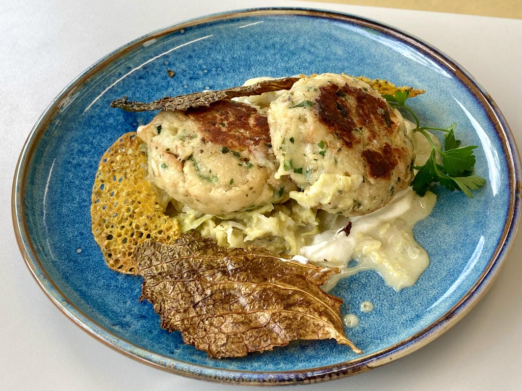 Die zwei Doppelstunden der Schlemmerbande inklusive Küche-Aufräumen sind vergangen wie im Flug. Am Ende können alle eine „mega“ Kombi miteinander genießen. Patricia Steiniger von der AOK-Kreisstelle Ulm-Biberach ist genauso angetan vom Ergebnis wie der Schulleiter Tobias Heep, der zum Schluss vorbeischaut und sich über ein tolles Mittagessen freuen kann. Nichts bleibt übrig, bis auf ein paar Chips, die ergänzend zum Rahmwirsing als Deko gemacht wurden. Aber auch die sind so mega, dass wir hier unbedingt das einfache Rezept weitergeben müssen.