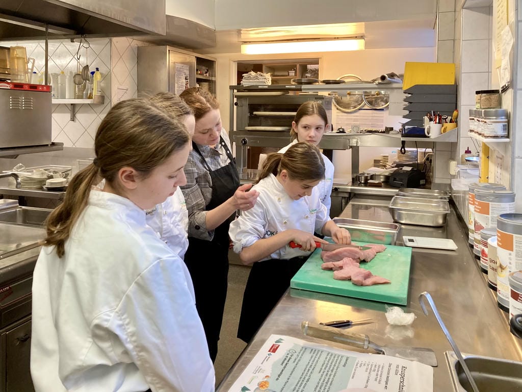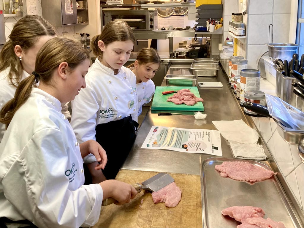In der Küche macht Aline eine kleine Messerkunde, bevor es an das ordentlich große Stück Putenfleisch geht: kleine Sehnen und Silberhaut entfernen, in einigermaßen gleich große Schnitzel schneiden, und zwar gegen die Faser. Dann bleibt das Fleisch zarter. Dann müssen die Teile platt geklopft werden, was gar nicht so leicht ist.
