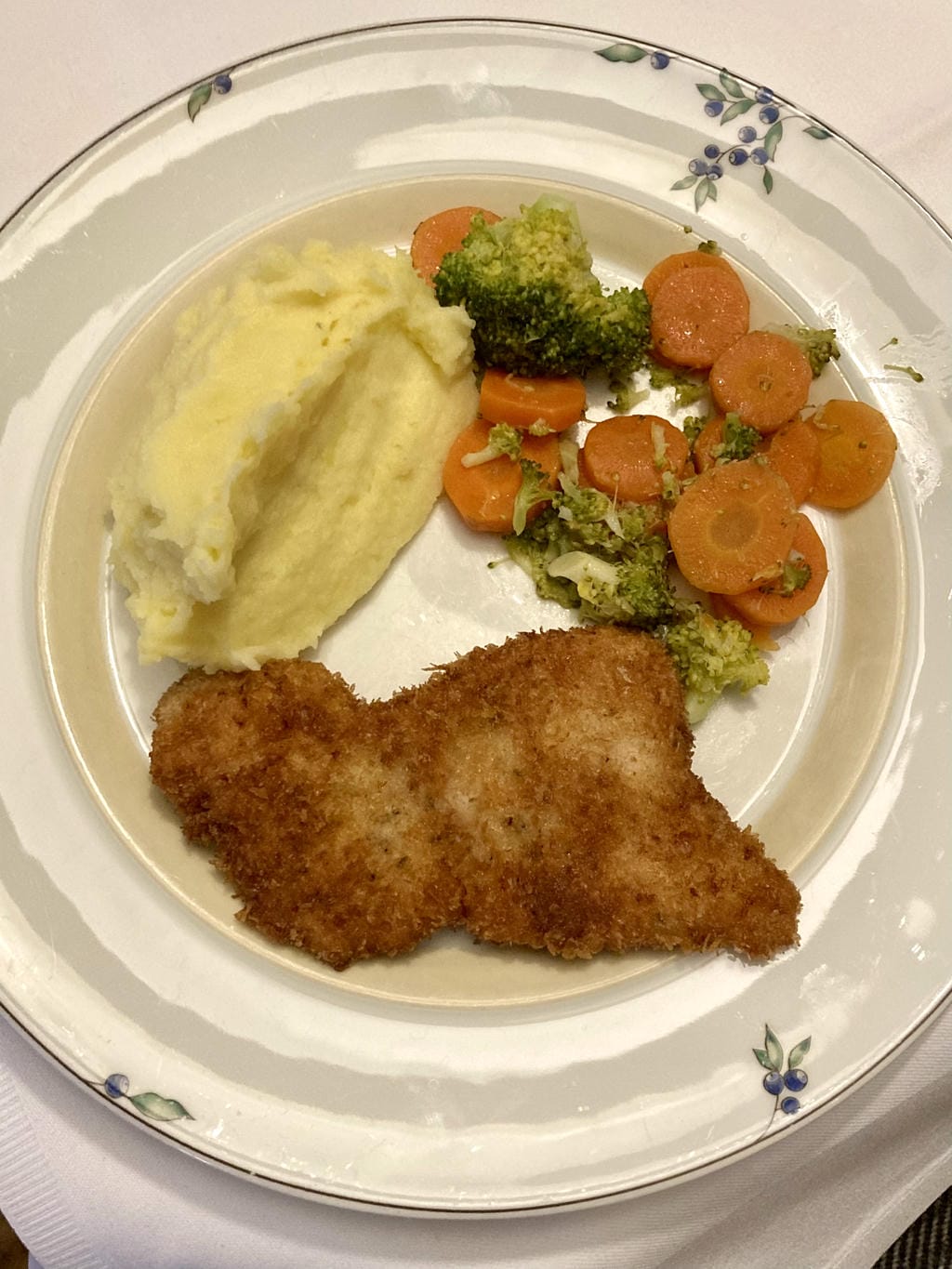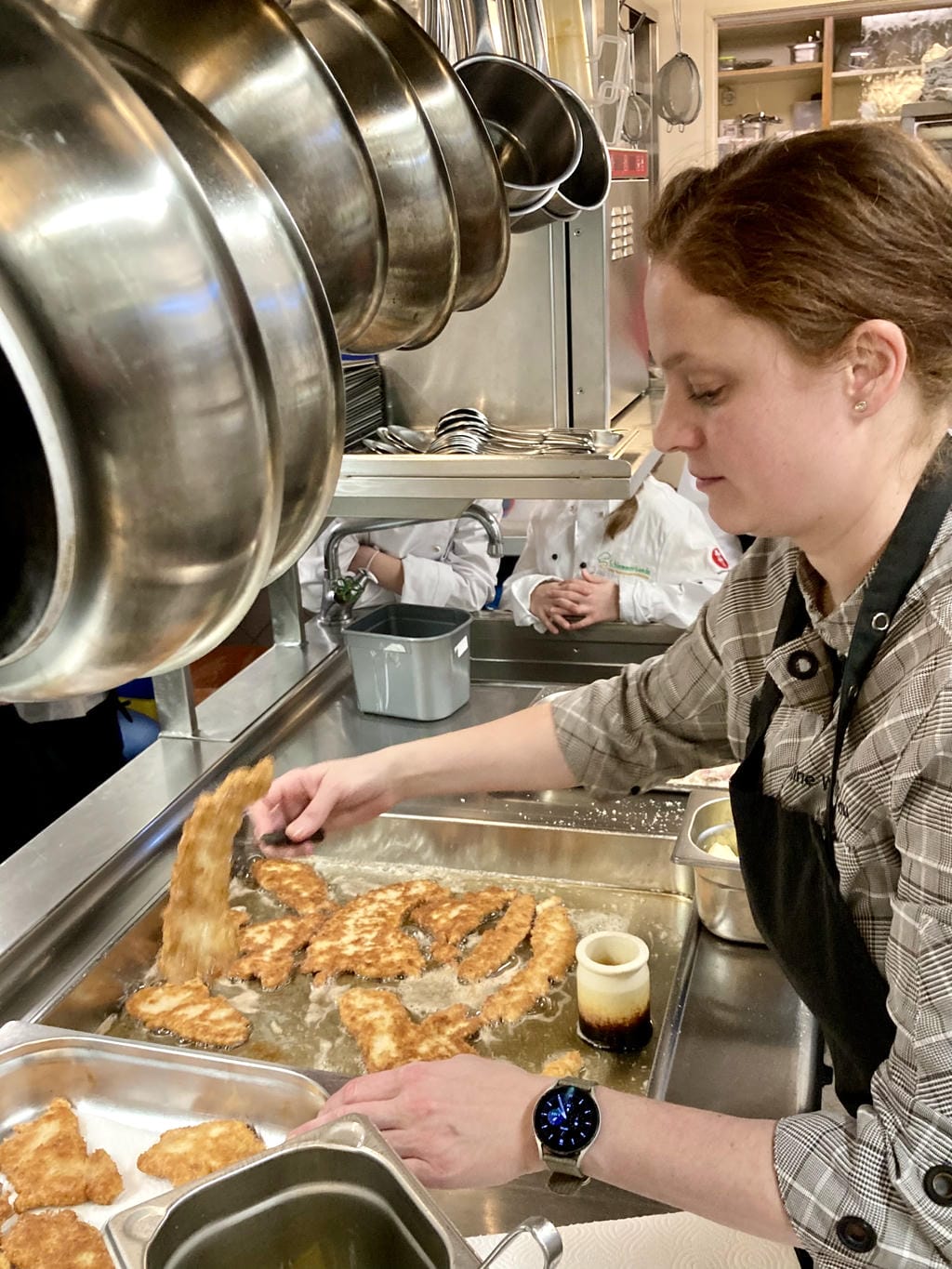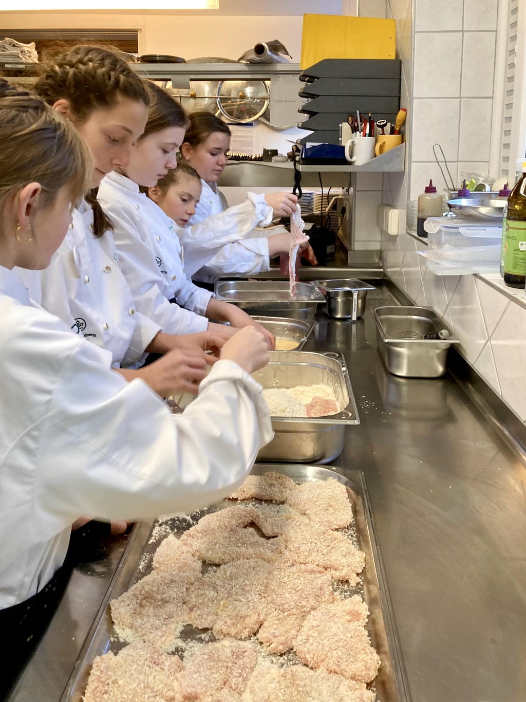 Das Gemüse läuft nebenbei fast von allein, die gar gekochten Kartoffeln kommen nach und nach in die Presse, werden in eine große Schüssel gedrückt und anschließend mit der heißen gewürzten Milch mit einem großen Schneebesen verrührt. Am spannendsten sind natürlich die Schnitzel. Eine sogenannte Straße wird aufgebaut, an der die Kinder in der Reihe stehen und das Fleisch erst in Mehl, dann in verrührten Eiern und schließlich in einer Mischung aus Semmelbröseln und Cornflakes wenden, damit die Schnitzel schön knusprig werden. Aline hat schon den Herd angemacht. „Schnitzel zu Hause nie ohne die Eltern machen“, warnt sie, denn mit heißem Fett ist nicht zu spaßen. In den Tiefbräter, der wie eine große Wanne ist und die Pfanne ersetzt, hat sie ganz schön viel Öl rein, sodass die Schnitzel schon beinahe frittiert werden.