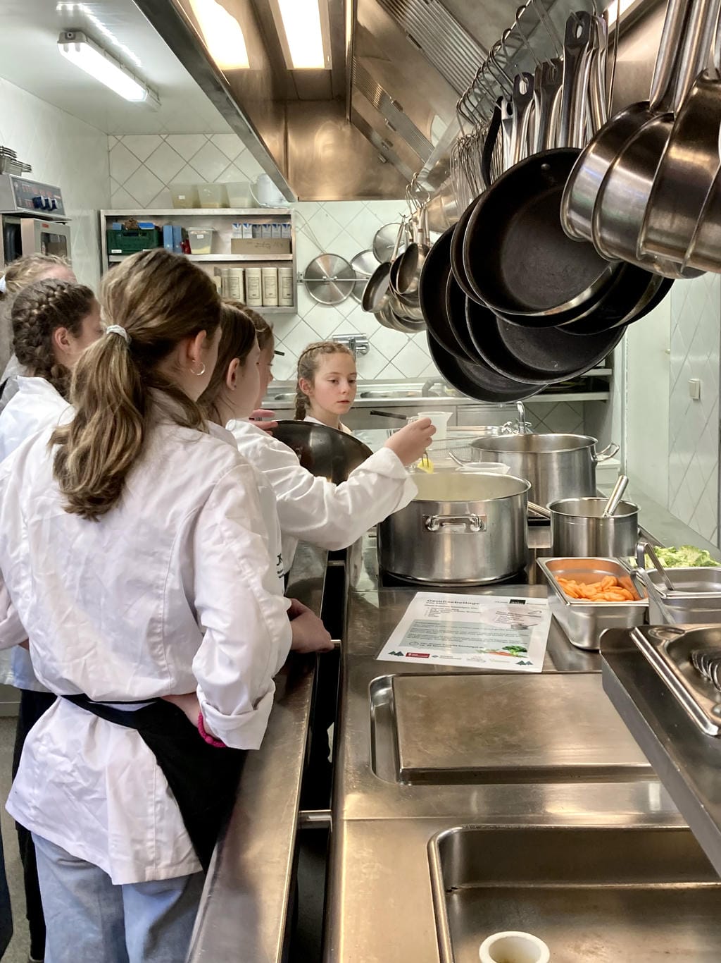 Die Küchenchefin teilt die Schlemmerbande in drei Gruppen: Team Schnitzel, Team Kartoffelpüree und Team Gemüse – denn sie hat ja noch Unterstützung von ihrer rechten Hand Claudia Steurenthaler. Auch Johanna Höpfl und Uta Thoma von der Hochschwarzwald Tourismus GmbH, die in Kooperation mit dem Naturpark Südschwarzwald Träger der Schlemmerbande ist, sind mit vollem Einsatz dabei. In einem der Gasträume werden gemeinsam Kartoffeln um die Wette geschält und Gemüse geputzt.