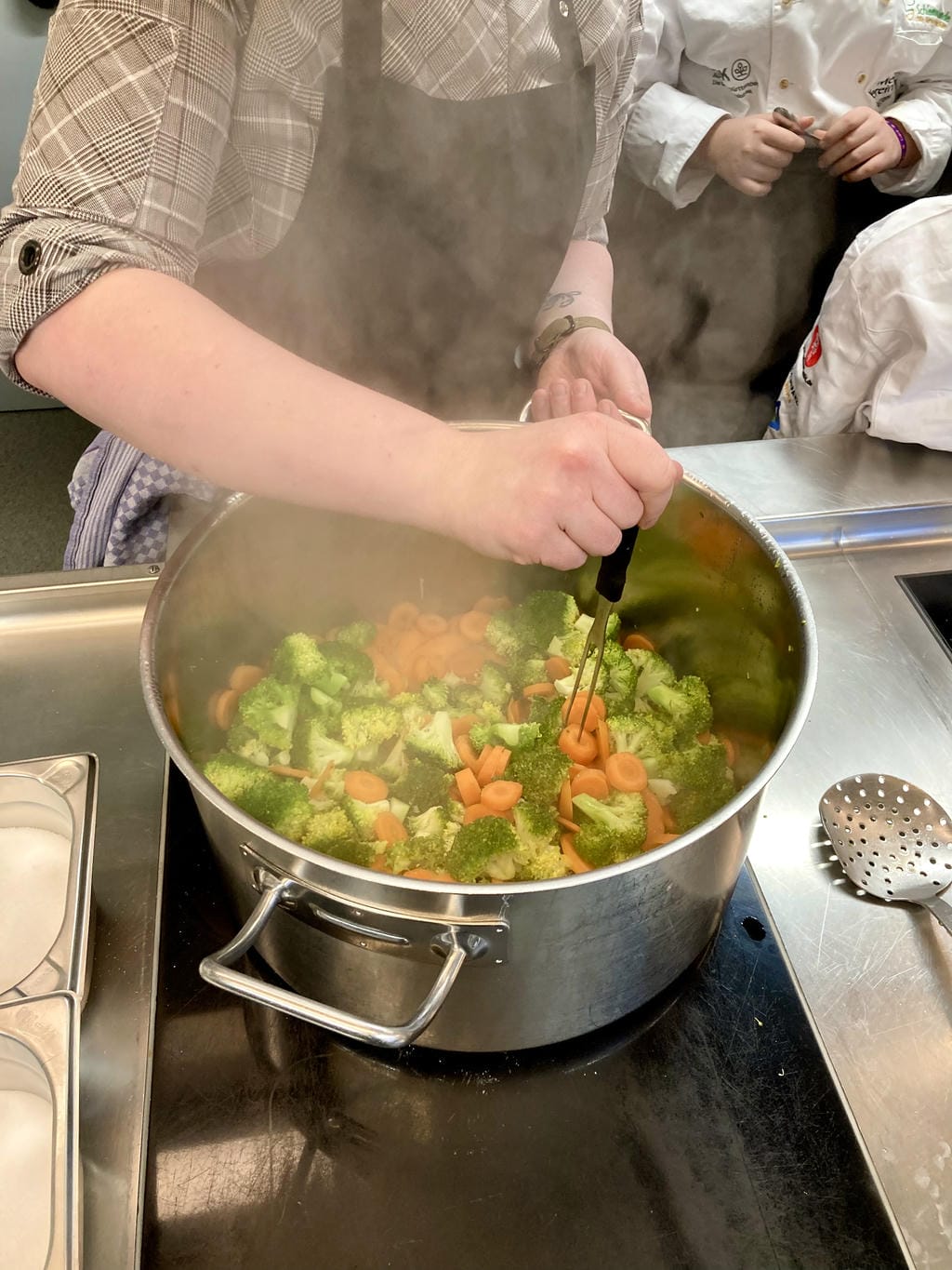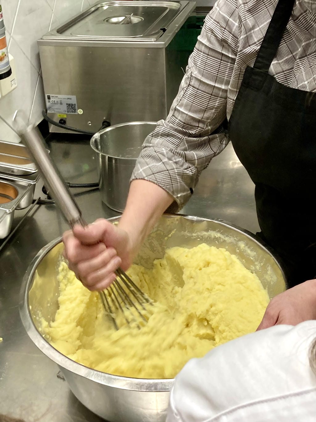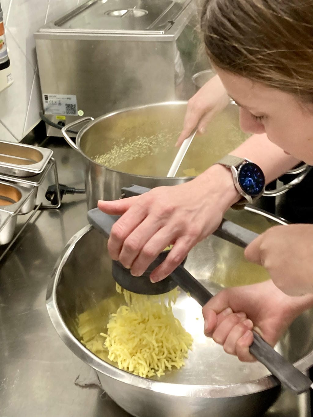 Derweil haben Team Kartoffel und Team Gemüse geliefert und ist nun die ganze Schlemmerbande in der Küche versammelt. Die Kartoffeln in den einen riesigen Topf, das Gemüse in den anderen, und in einem kleinen dritten Topf Milch erhitzen, Butter, Salz, Pfeffer, Muskatnuss rein. Beim Salzen geht Adrian mit den Fingerspitzen recht vorsichtig vor. „Mutig sein beim Würzen“, gibt die Köchin Claudia einen frühen rat ihrer Chefin weiter – und greift fast mit der vollen Hand ins Salz. Alles in allem müssen die Portionen ja für 20 Leute reichen. Dementsprechend groß muss man auch bei den Zutaten denken.