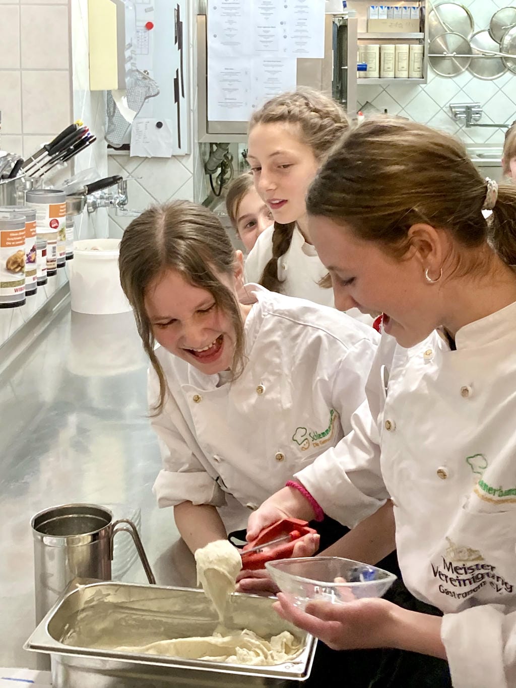 Als die Schnitzel alle goldbraun sind, geht es ans Anrichten. „Der Rand gehört dem Service“, sagt Claudia den Kindern, die die Teller also nicht zu voll machen sollen. Trotz Nachschlag bleiben einige Schnitzel übrig, denn es wurden ganz schön viele vorbereitet. „Da könnt ihr morgen Schnitzelweckle machen!“ Beim Eis ist das anders, denn das gibt es ja auch noch – aus gefrorenen reifen Bananen mit Sahne und Honig. Das kommt einfach alles in den Thermomix (oder Mixer, wenn man keinen hat). Jedenfalls: Die Schlange am großen Eisbehälter in der Küche hört gar nicht mehr auf, denn wenn ein Kind eine Portion verputzt hat, stellt es sich gleich wieder hinten an. Und da es bei fast der Hälfte der Kinder zu Hause einen Thermomix gibt – für zum Beispiel Milchreis oder Pfannkuchenteig machen, wie wir hören – würde es uns nicht wundern, wenn in der einen oder anderen Familie demnächst unter Anleitung eines Schlemmerbandenmitglieds auch die große Eisproduktion startet …
